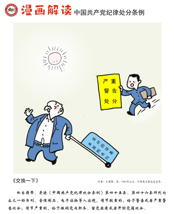 紀(jì)律是我們黨的生命線,加強紀(jì)律建設(shè)是全面從嚴(yán)治黨的治本之策。為深入貫徹落實十九屆中央紀(jì)委四次全會關(guān)于加強黨紀(jì)國法教育的部署要求,強化黨規(guī)黨紀(jì)的學(xué)習(xí)宣傳、貫徹執(zhí)行,使鐵的紀(jì)律真正轉(zhuǎn)化為黨員干部的日常習(xí)慣和自覺遵循,中央紀(jì)委國家監(jiān)委網(wǎng)站聯(lián)合河北省紀(jì)委監(jiān)委,以漫畫形式對《中國共產(chǎn)黨紀(jì)律處分條例》進(jìn)行解讀。